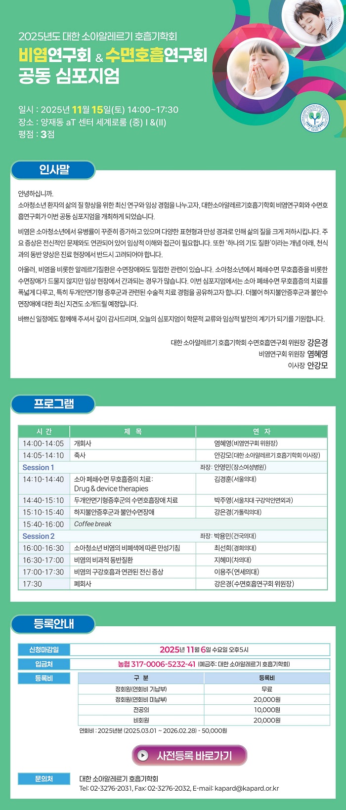 소알호) 2025 비염연구회&수면호흡연구회 공동 심포지움 개최 안내