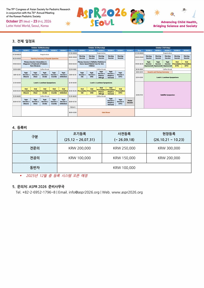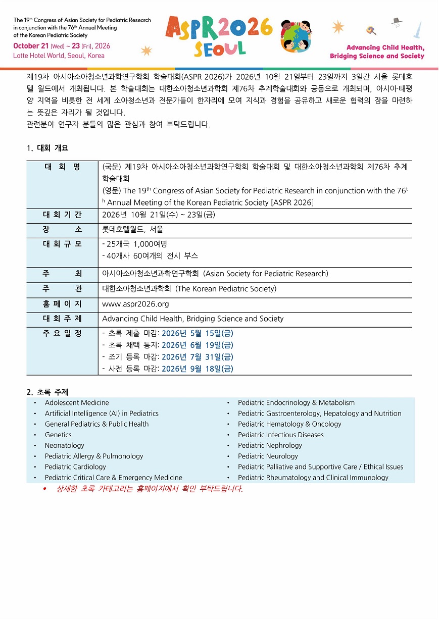 [ASPR 2026] 제19차 아시아소아청소년과학연구학회 학술대회 및 대한소아청소년과학회 제76차 추계학술대회 홍보 안내